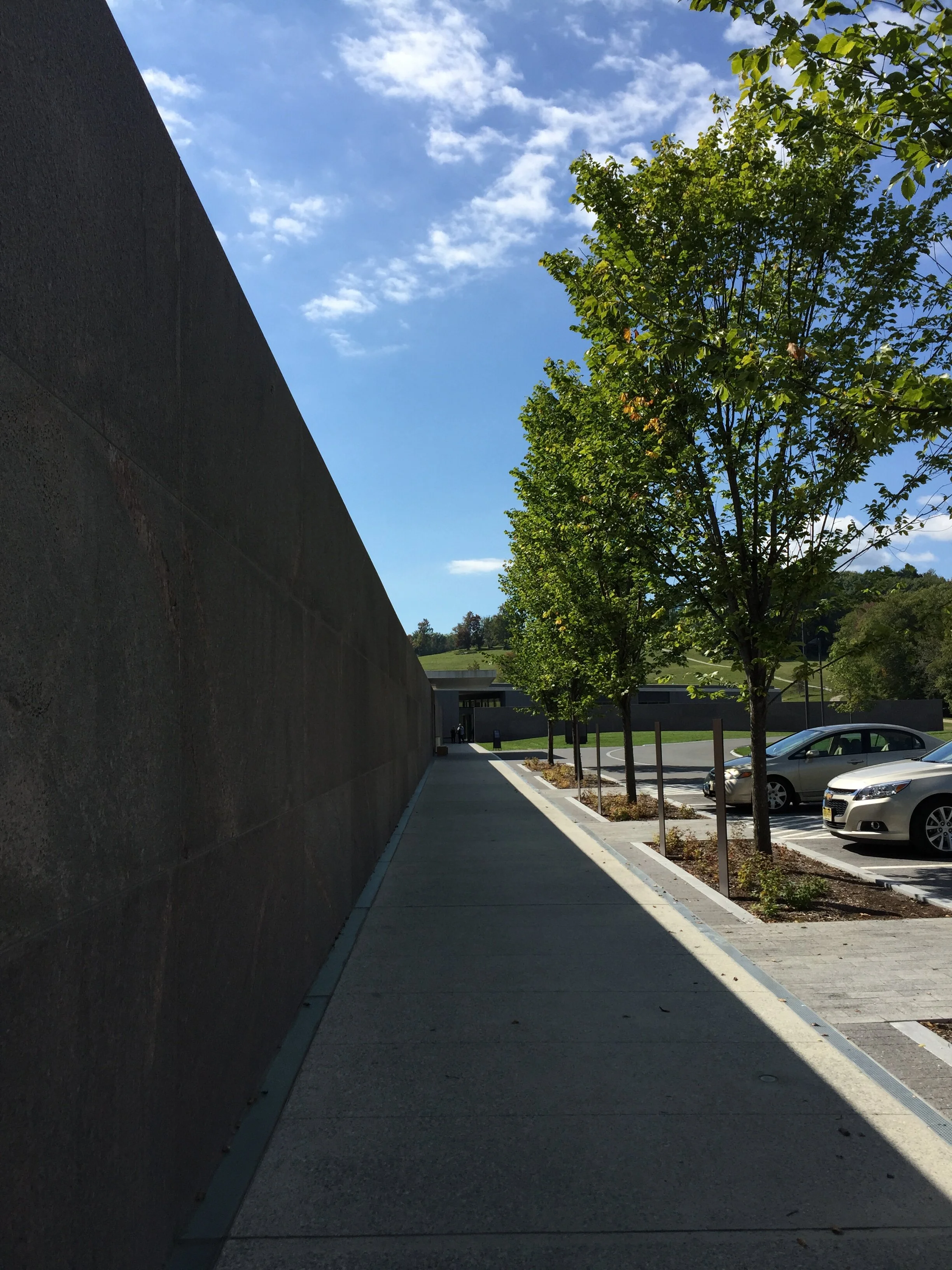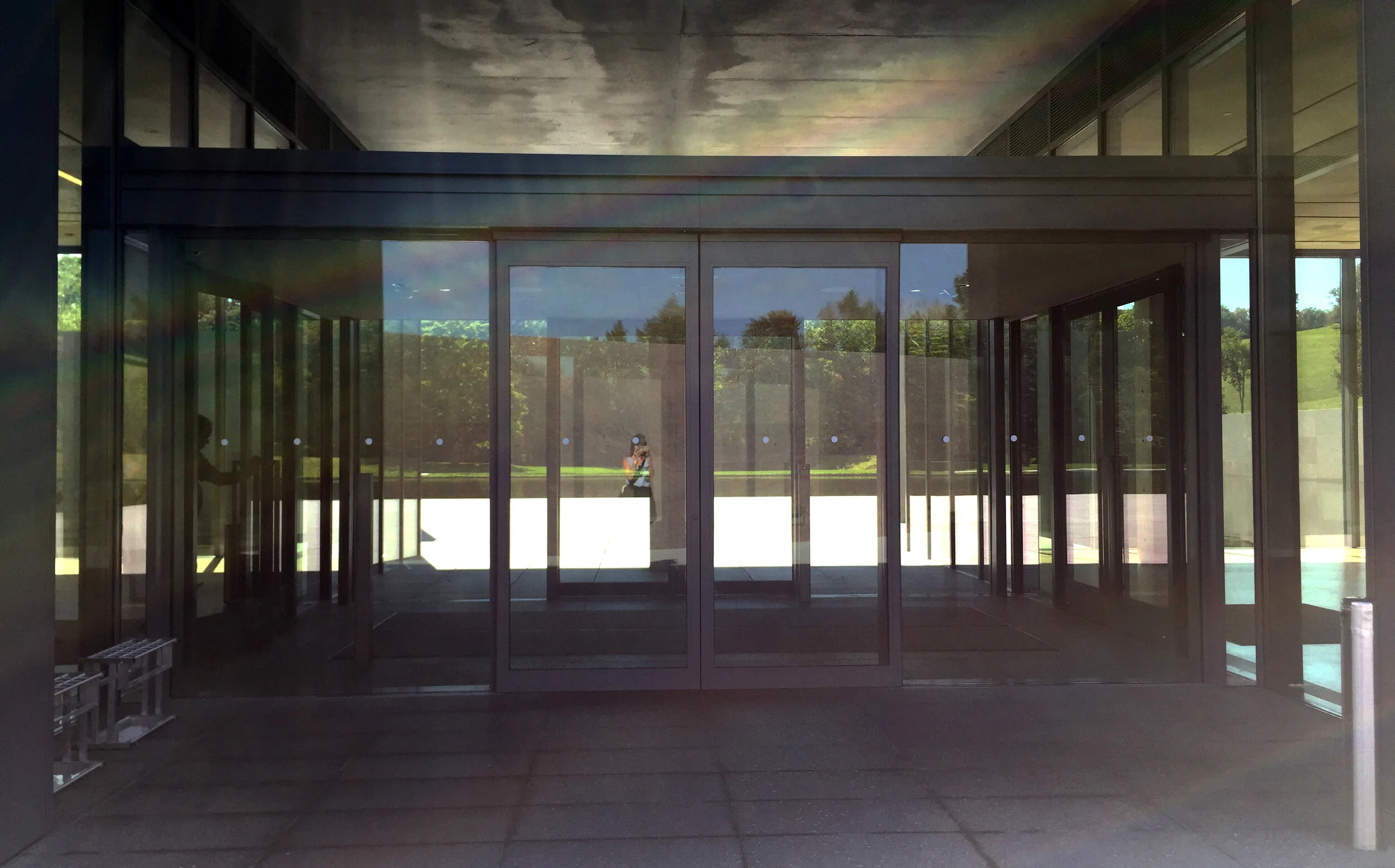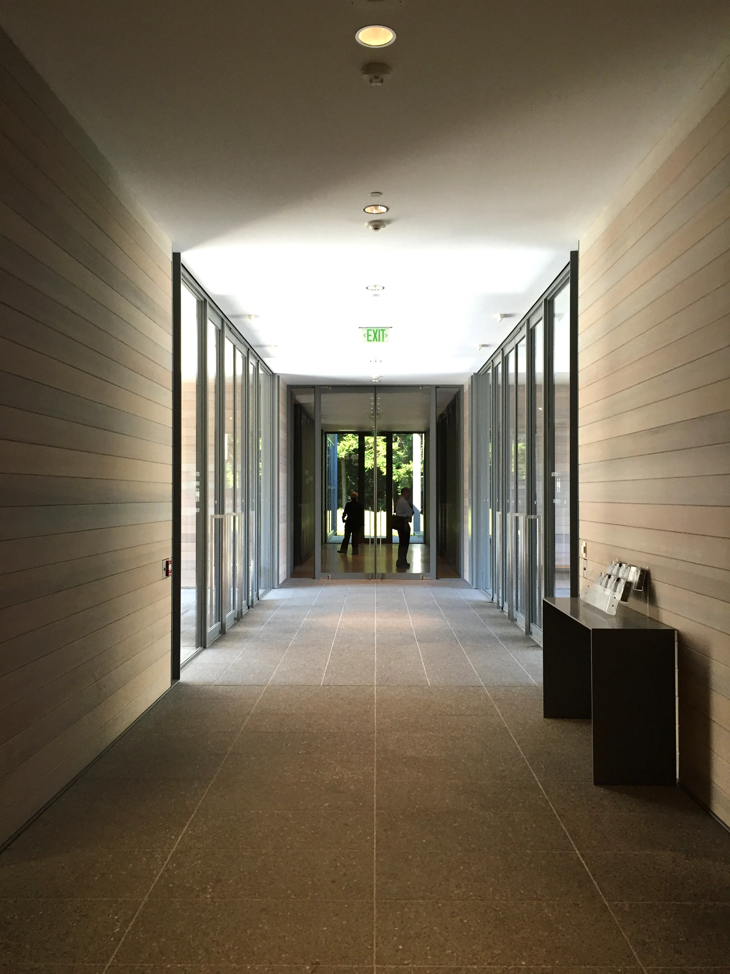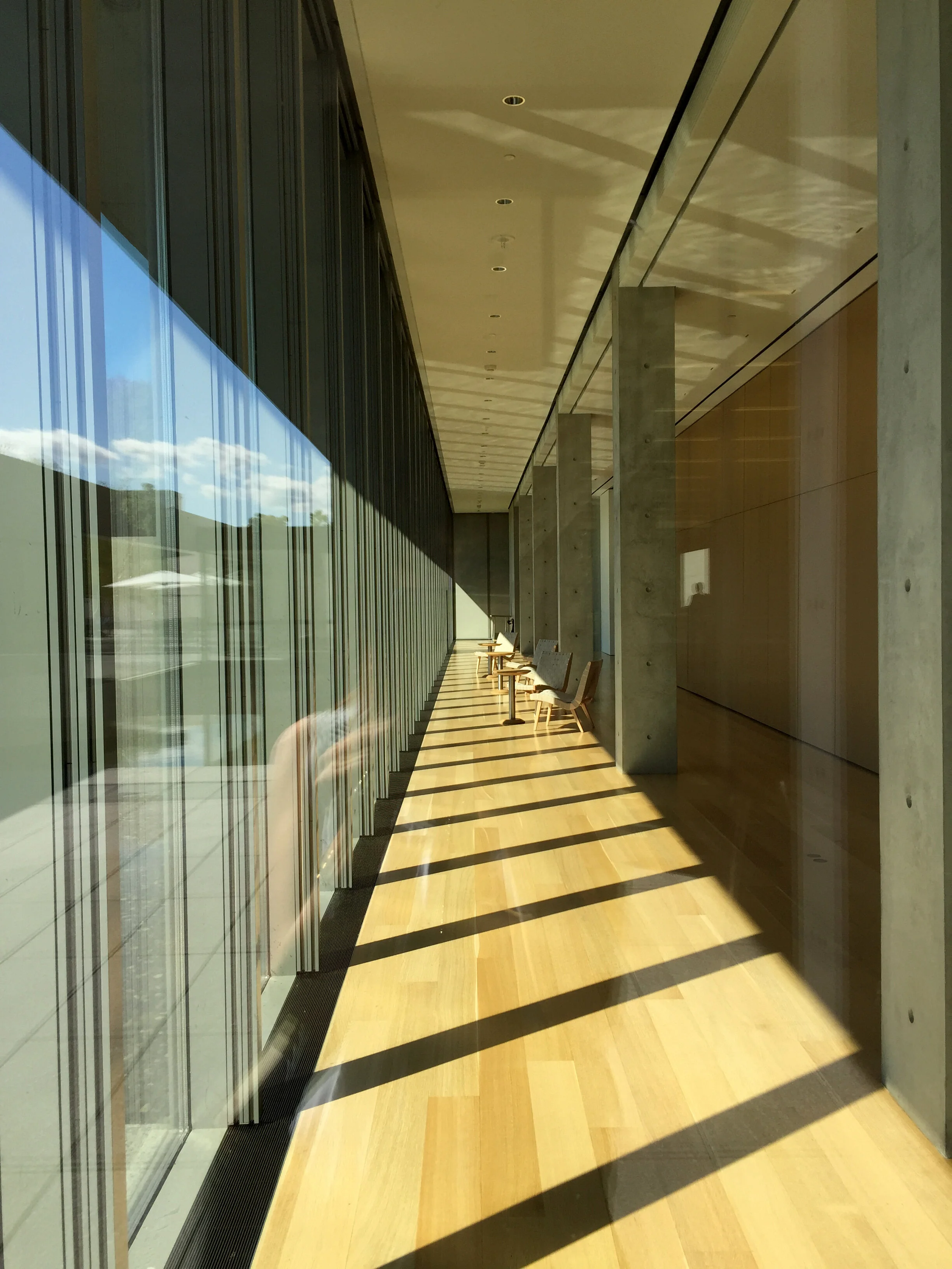 The extended promenade along a granite wall is also processional,  you could say it's a sequence not unlike climbing the steps on 5th Avenue to enter the Great Hall in the Met, but, significantly, the procession is flat, the threshold is not elevated and the doors are entirely transparent.  (So much so, it was impossible to capture a photograph without total burnout.) Furthermore, the building is almost achingly devoid of meaning or reference. It is framing the experience for you but not defining it or prescribing it and, significantly in a rural art campus, the framing is designed to draw attention to the landscape, not to the collections.