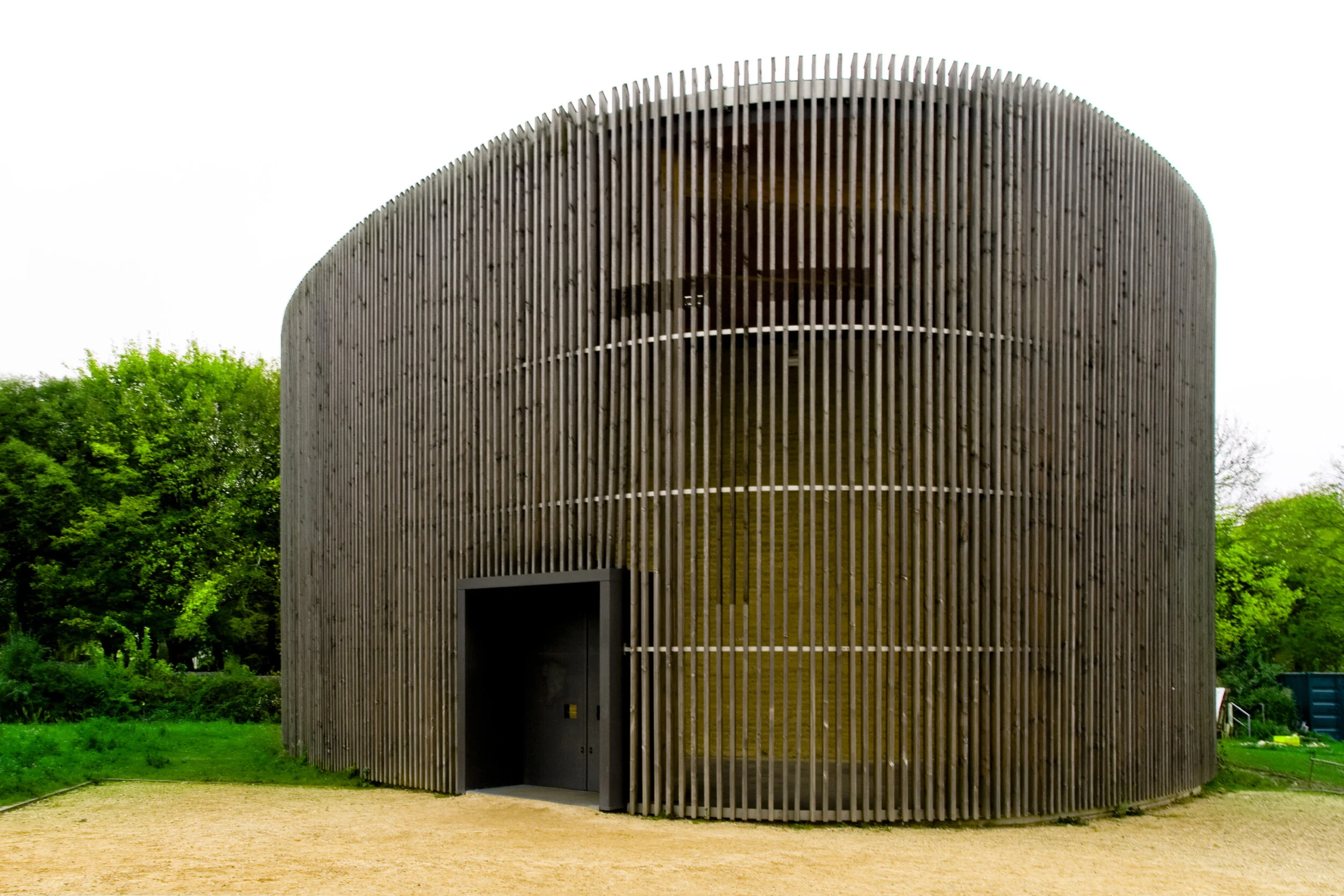 Timber slatted external shell embraces the oval shape of the internal rammed earth structure.