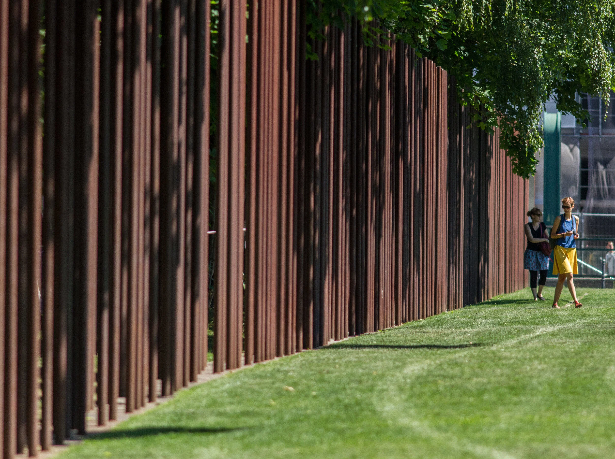 Dual rows of corten steel poles mark the route of the Berlin Wall along Bernauer Strasse. Image by John Dawson