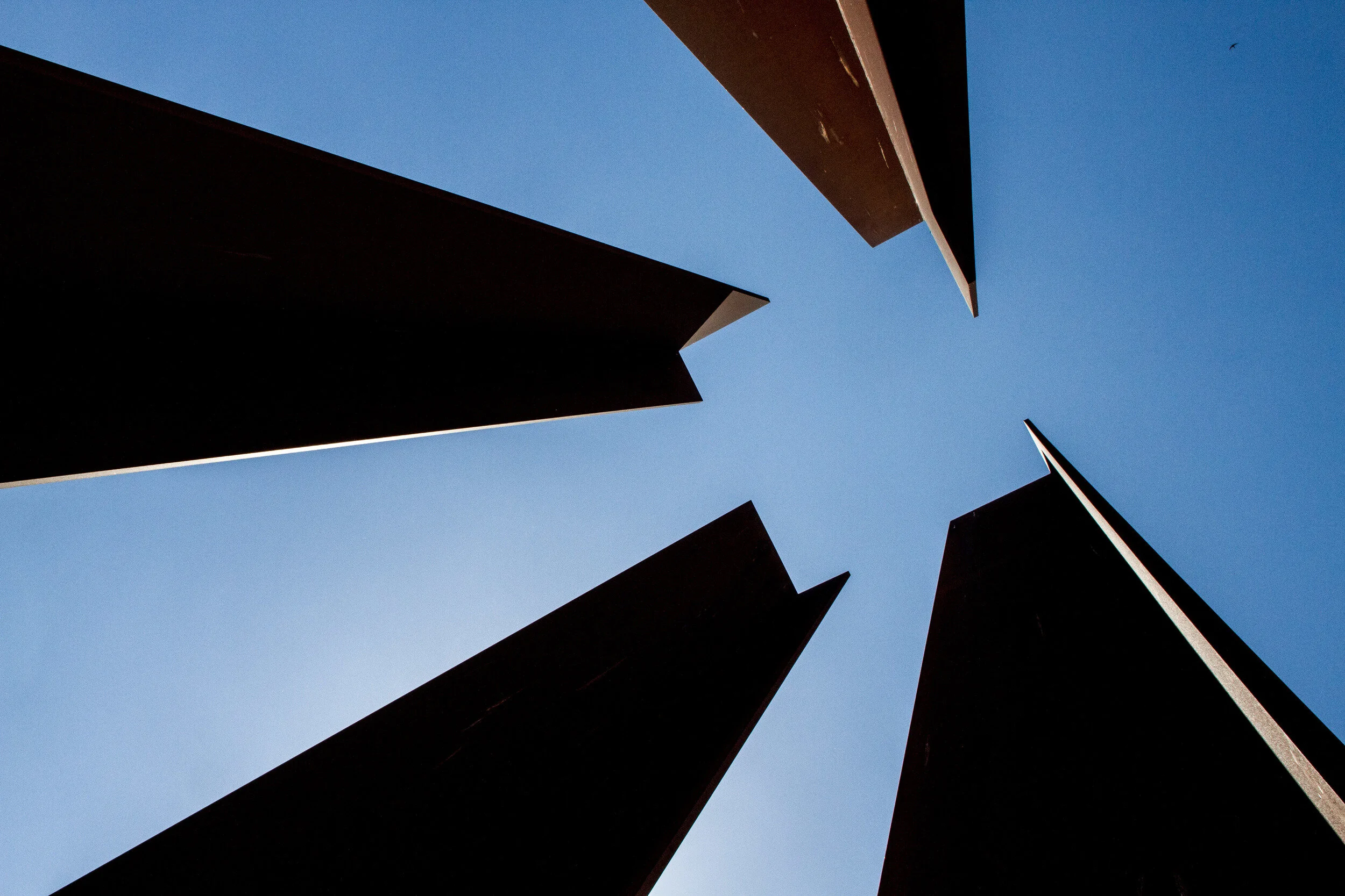 Field of Stelae known as the Holocaust Memorial by Peter Eisenman. The austerity of the structures, their labyrinth and repetition are powerfully emotive yet very understated. A separate exhibition centre provides documentary archive and layers of story that are only hinted at by the memorial itself. Image by John Dawson